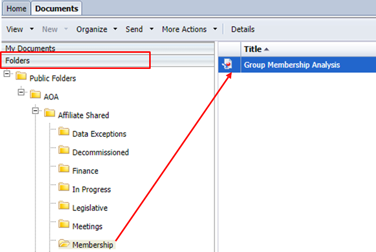 the file path: Documents>Folders>AOA>Affiliate Shared>Membership