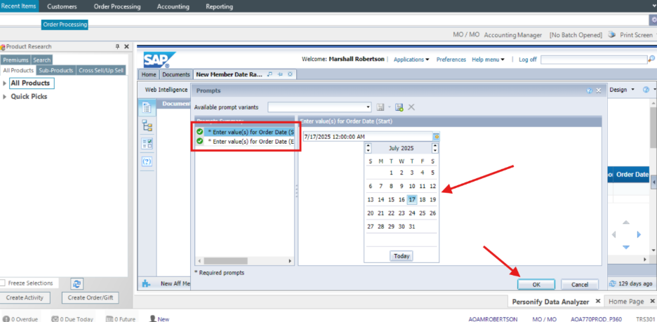 Step 6: Set the target date range you’d like to use by clicking the first “Enter value(s) for Order Date” prompt for the beginning date, then the second prompt for your end date.