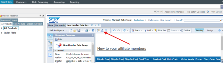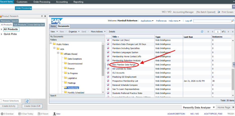 Step 5: Drill down by double clicking Public Folders > AOA > Affiliate Shared > Membership, then Open the New Member Date Range report.