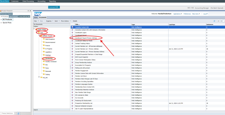 Step 5: Drill down by double clicking Public Folders > AOA > Affiliate Shared > Membership, then Open the Constituent Report-Primary Address report.